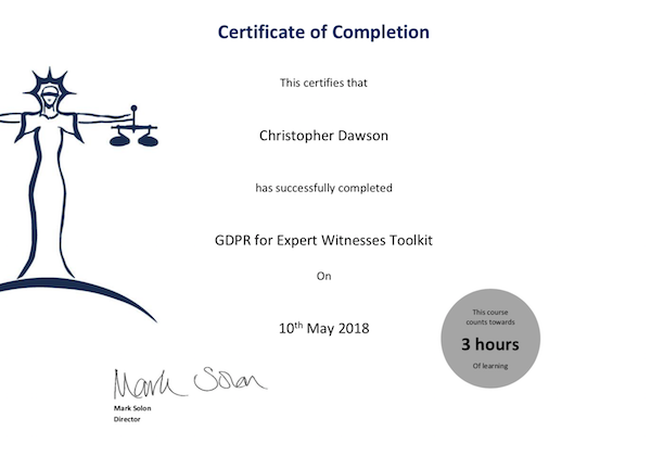 I have completed the Bond Solon Training in GDPR for Expert Witnesses - My Certificate is shown below.